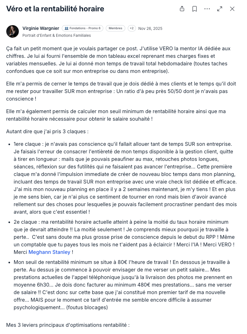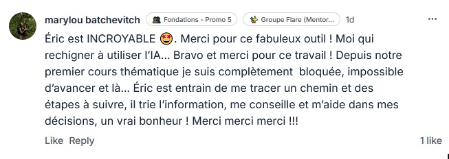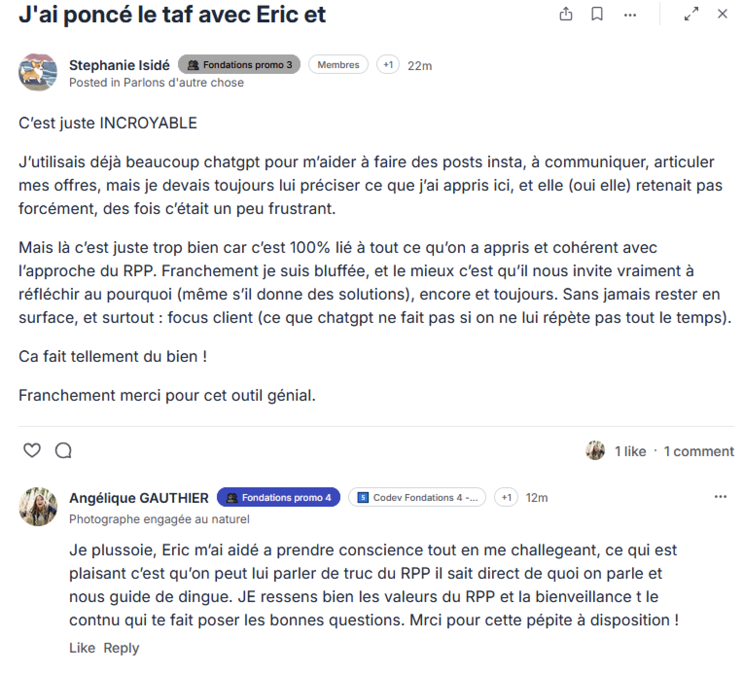 Nos mentors IA (Eric & Véro) ont été formés par le RPP sur le plan pédagogique, et ont été nourris de centaines d’études de cas réels. Les retours à leurs sujets sont bluffants ! Ils permettent vraiment une forme d’accompagnement, différent. Et puis eux, on peut les consulter 24/24 – 7/7.